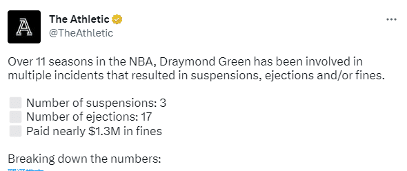 据美媒统计,职业生涯至今,格林11年一共被禁赛3场,被驱逐17次;季后赛出战147场,总共出现6次恶犯犯规和27次技犯,生涯罚款总额约130万美元。