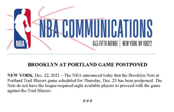 来源:JRS直播12-23 14:07JRS直播12月23日讯,由于联盟新冠疫情全面爆发,NBA不想延期比赛也不行;NBA官方再次宣布延期两场比赛,篮网对阵开拓者和猛龙对阵公牛的比赛都已被推迟,原因是篮网、猛龙都不能凑够8名球员上场。