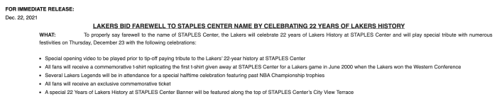 斯台普斯中心的标志早已被拆掉,而且新的标志已经被安装好,球馆外挂着新标志,而球馆地板上仍旧印着斯台普斯中心;不过年终大战这一天,湖人主场的内部也将换上全新的标志和元素,而斯台普斯中心的时代彻底结束了。