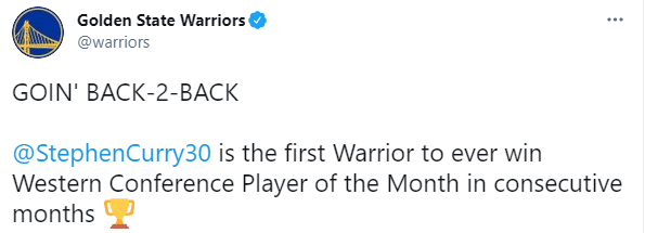 勇士官方第一时间恭喜库里连续两个月当选月最佳成为勇士队史第一人。