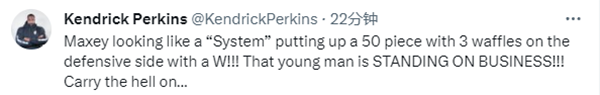 名嘴帕金斯嘲讽哈登,发推写道:马克西看起来就像个‘体系’,他砍下50分还在防守端送出3盖帽,为球队带来胜利。这位年轻人正在做自己!!