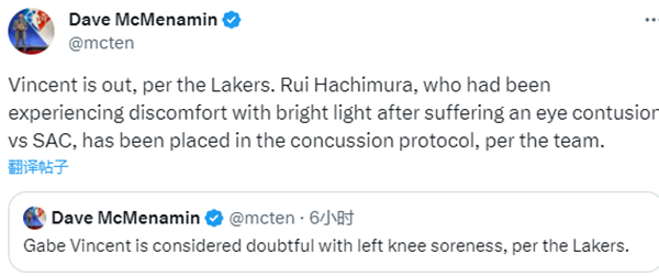 八村垒连续2场缺席比赛,目前他仍旧对强光感到不适,已经被纳入脑震荡保护程序之中。