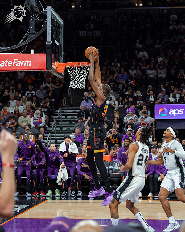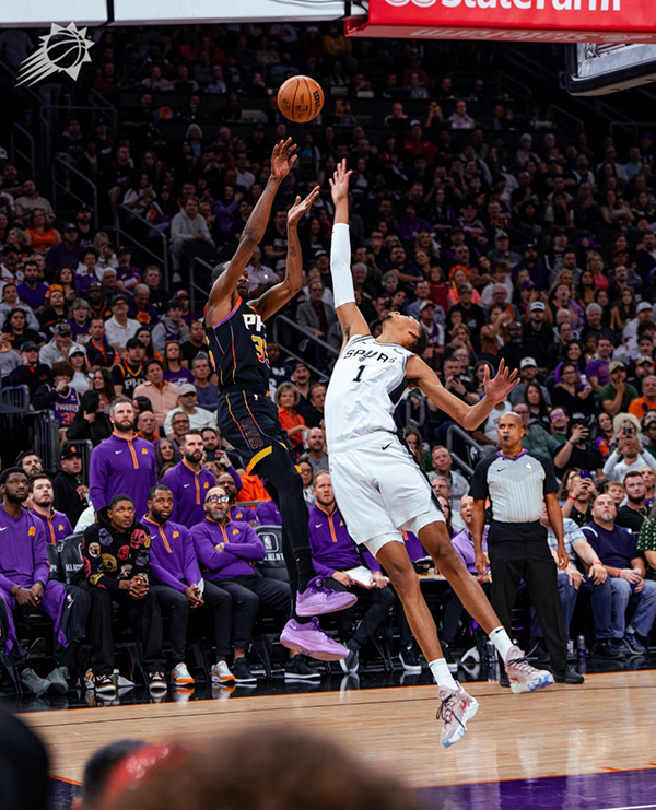 太阳8-0开场捍卫主场,期间杜兰特反击暴扣,一对一单防抢断文班亚马,死神给新科状元上课,杜兰特的状态十分火热,单节7中5轰下10分,第一节带队27-18领先马刺9分。