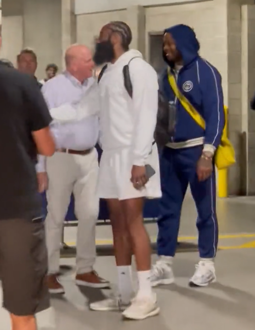 哈登身穿白色连帽卫衣和短裤、背着双肩包来到快船球馆,塔克则穿着一套深色套装,他们一起亮相,快船老板鲍尔默和总裁劳伦斯-弗兰克都亲自出面迎接他们,鲍尔默拥抱哈登和塔克,哈登咧嘴大笑凸显心情,之后鲍尔默带着他们走进球馆内部。