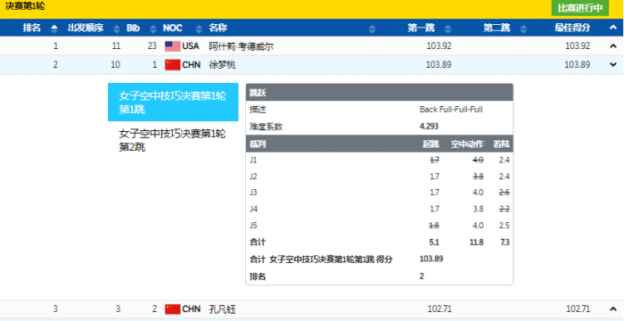 来源:JRS直播02-14 19:40JRS直播02月14日讯 ,北京冬奥会自由式滑雪女子空中技巧决赛开始,中国队的孔凡钰和徐梦桃出战,孔凡钰是2018年平昌冬奥会铜牌得主,徐梦桃是2014年索契冬奥会银牌得主。决赛的赛制是第一轮每名运动员跳两次,取其中一次最好成绩进行排名,前六晋级到决赛第二轮。决赛第二轮只跳一次,决出金银铜牌。
