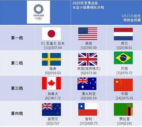 奥运女足的分档分别是第一档日本、美国、荷兰;第二档瑞典、英格兰、巴西;第三档加拿大、澳大利亚、中国;第四档新西兰、智利、赞比亚。前三档的球队只有日本和中国女足排名在世界10名开外,日本女足世界第11名,其他7队全是世界排名前十的队伍。