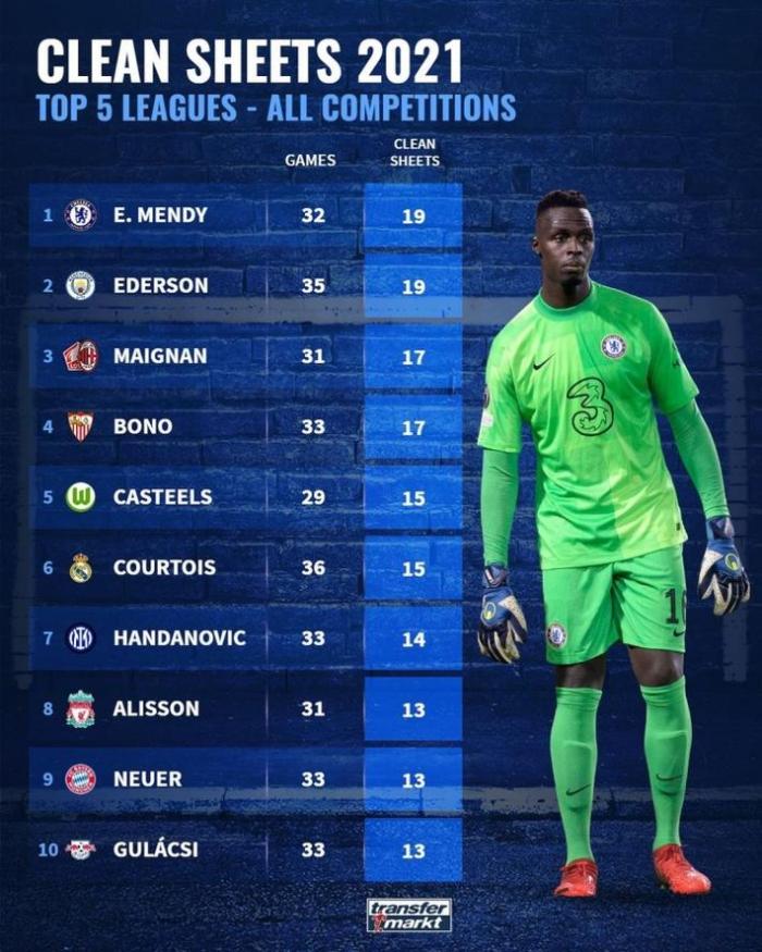 JRS直播9月24日讯 今日,德转统计了2021年度至今五大联赛门将零封榜,其中切尔西门将门迪排名榜首。