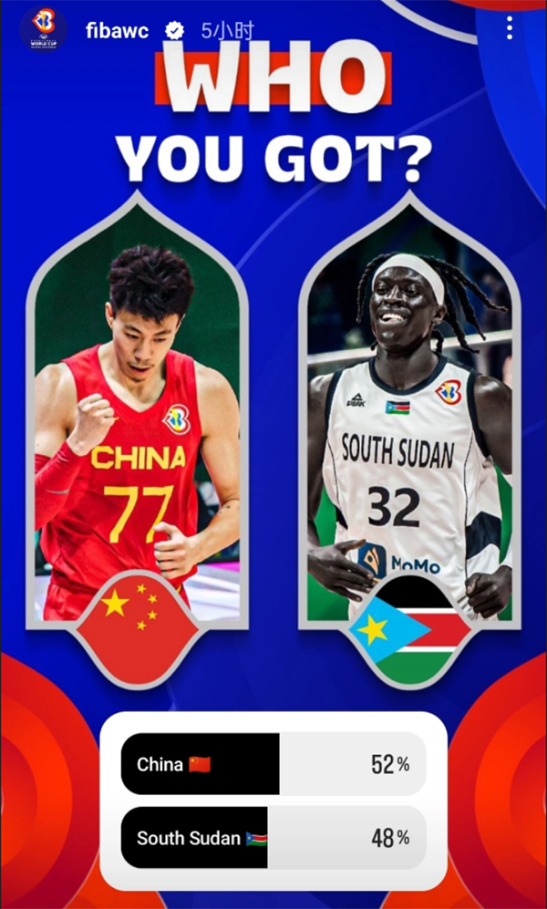 国际篮联世界杯官方公布了中国和南苏丹一战的球迷投票结果,52%的球迷相信中国队能够击败南苏丹,后者获得48%的支持率;从投票结果来看,这将是一场十分胶着的比赛,两队肯定都会全力以赴。